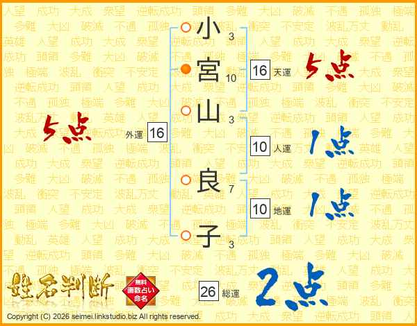 小(3画)宮(10画)山(3画) 良(7画)子(3画)