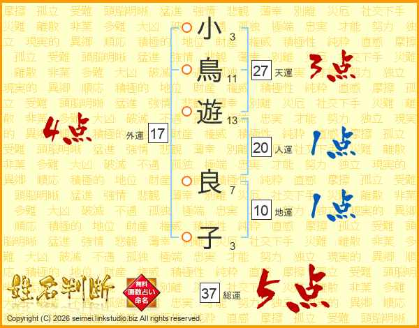 小鳥遊良子さんの総運は37画の5点!