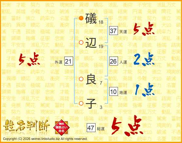 生活面を象徴する運勢です。外部から受ける影響力を表し、結婚運、家庭運や職場、環境への順応性を表します。総運から人運を引いた画数。姓や名が1文字の場合を除く。