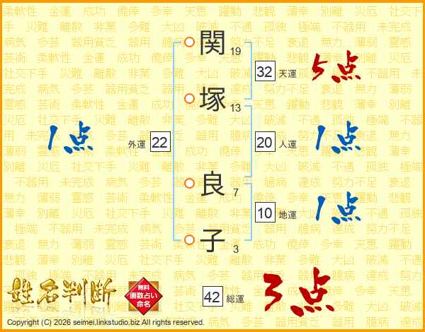 生活面を象徴する運勢です。外部から受ける影響力を表し、結婚運、家庭運や職場、環境への順応性を表します。総運から人運を引いた画数。姓や名が1文字の場合を除く。