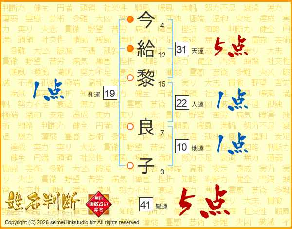 今(4画)給(12画)黎(15画) 良(7画)子(3画)