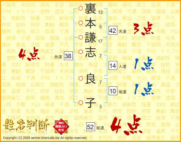 裏本謙志良子さんの総運は52画の4点!