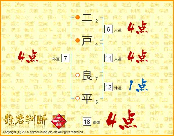 生活面を象徴する運勢です。外部から受ける影響力を表し、結婚運、家庭運や職場、環境への順応性を表します。総運から人運を引いた画数。姓や名が1文字の場合を除く。