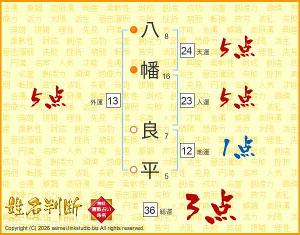 生活面を象徴する運勢です。外部から受ける影響力を表し、結婚運、家庭運や職場、環境への順応性を表します。総運から人運を引いた画数。姓や名が1文字の場合を除く。
