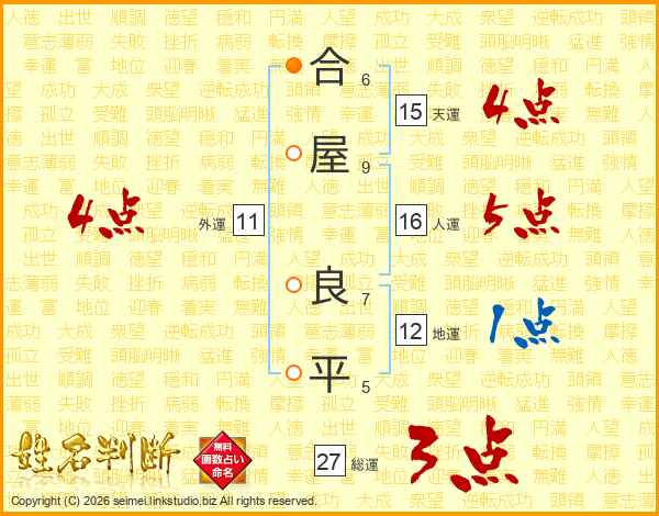 合(6画)屋(9画) 良(7画)平(5画)
