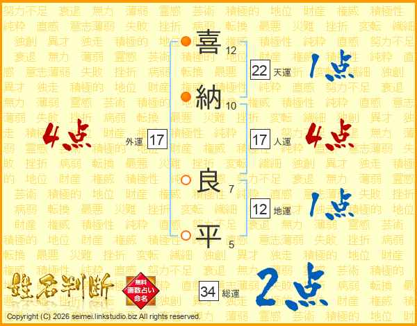 喜(12画)納(10画) 良(7画)平(5画)