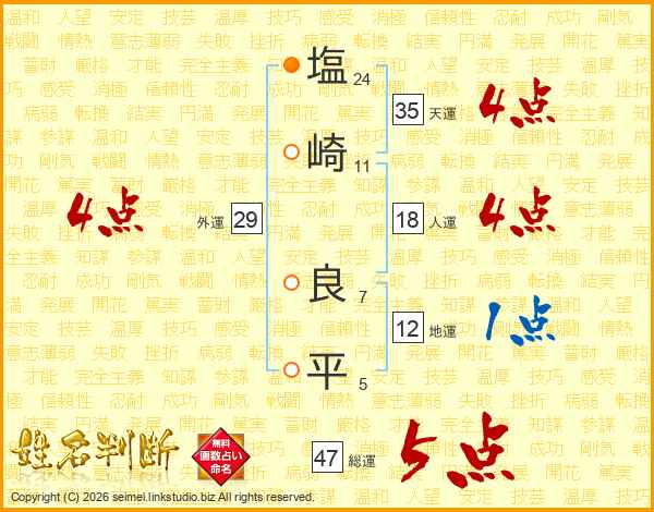 生活面を象徴する運勢です。外部から受ける影響力を表し、結婚運、家庭運や職場、環境への順応性を表します。総運から人運を引いた画数。姓や名が1文字の場合を除く。