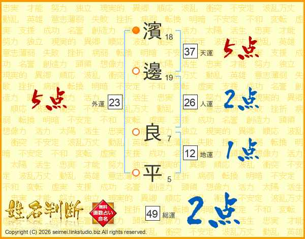画数の奇数(○陽)と偶数(●陰)の配列で吉凶を占います。どちらかにかたよる名前は大凶名で避ける必要があります。画数の奇数偶数。