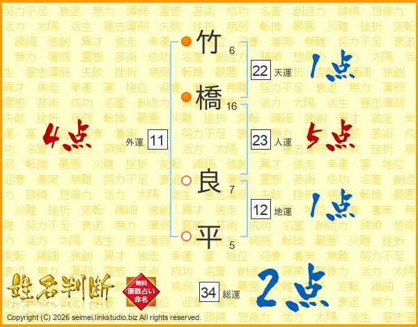 あなたの人生を表す1番重要な運勢です。生涯を通じて影響する総合運となり、主に50歳以降の晩年期に影響を及ぼします。苗字と名前の合計画数。