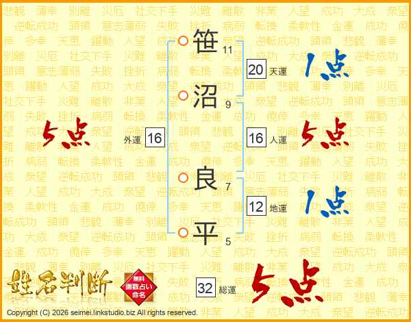 生活面を象徴する運勢です。外部から受ける影響力を表し、結婚運、家庭運や職場、環境への順応性を表します。総運から人運を引いた画数。姓や名が1文字の場合を除く。