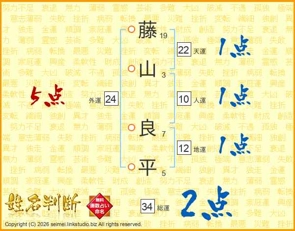 藤(19画)山(3画) 良(7画)平(5画)