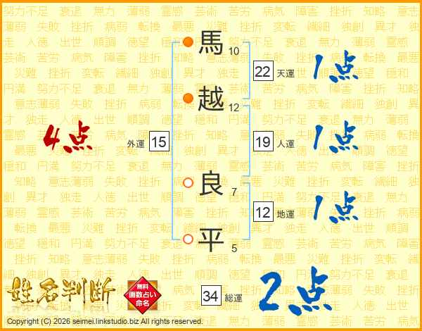 馬(10画)越(12画) 良(7画)平(5画)