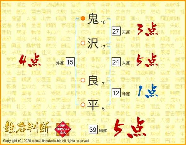 鬼沢良平さんの総運は39画の5点!