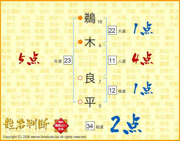 鵜(18画)木(4画) 良(7画)平(5画)