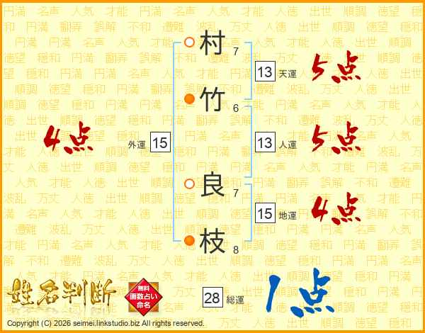 村(7画)竹(6画) 良(7画)枝(8画)