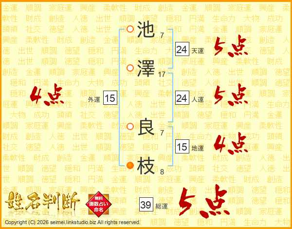 池(7画)澤(17画) 良(7画)枝(8画)