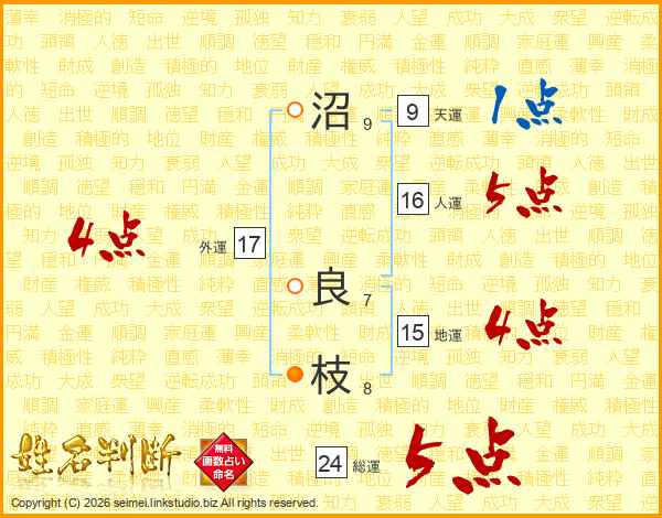 沼(9画) 良(7画)枝(8画)