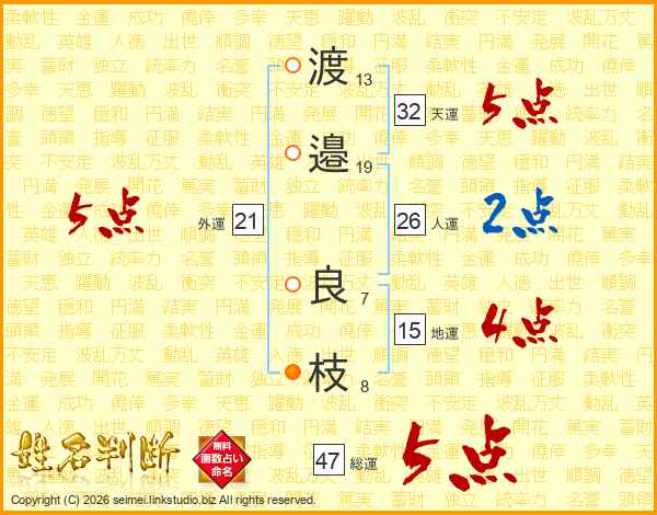 渡(13画)邉(19画) 良(7画)枝(8画)