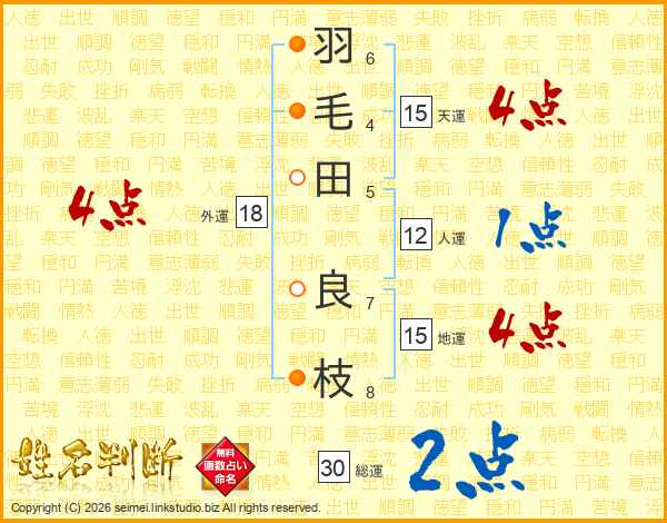羽(6画)毛(4画)田(5画) 良(7画)枝(8画)