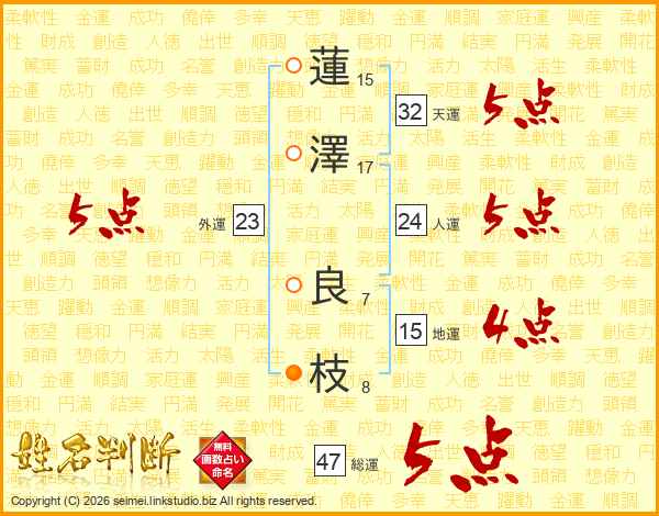蓮(15画)澤(17画) 良(7画)枝(8画)