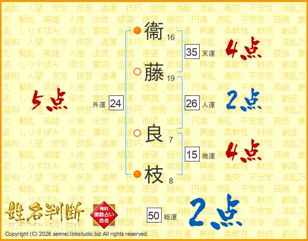 衞(16画)藤(19画) 良(7画)枝(8画)