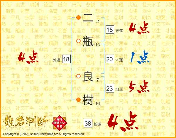 二瓶良樹さんの総運は38画の4点!