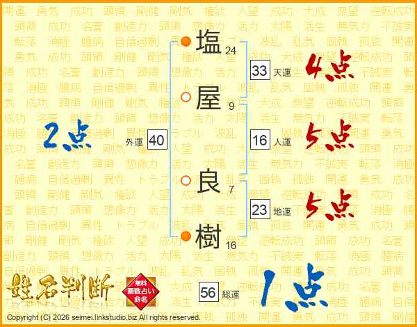 塩(24画)屋(9画) 良(7画)樹(16画)
