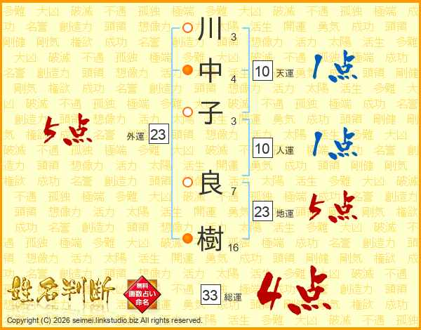 川(3画)中(4画)子(3画) 良(7画)樹(16画)
