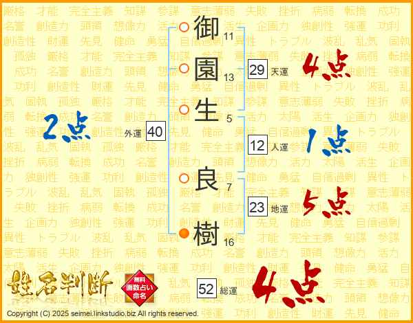 御(11画)園(13画)生(5画) 良(7画)樹(16画)