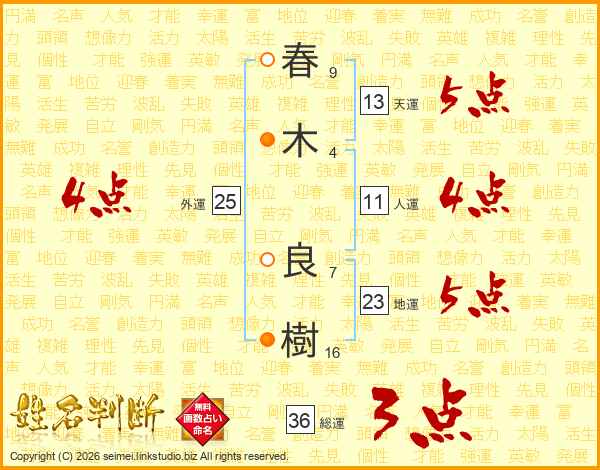 春(9画)木(4画) 良(7画)樹(16画)