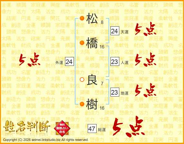 あなたの人生を表す1番重要な運勢です。生涯を通じて影響する総合運となり、主に50歳以降の晩年期に影響を及ぼします。苗字と名前の合計画数。