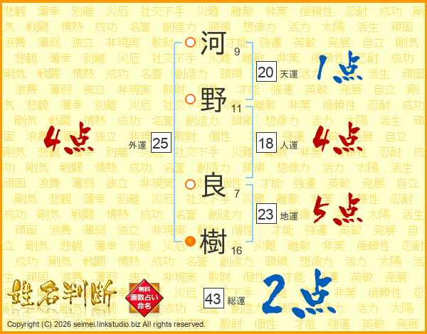 生活面を象徴する運勢です。外部から受ける影響力を表し、結婚運、家庭運や職場、環境への順応性を表します。総運から人運を引いた画数。姓や名が1文字の場合を除く。