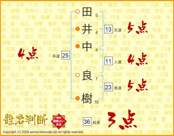 田(5画)井(4画)中(4画) 良(7画)樹(16画)