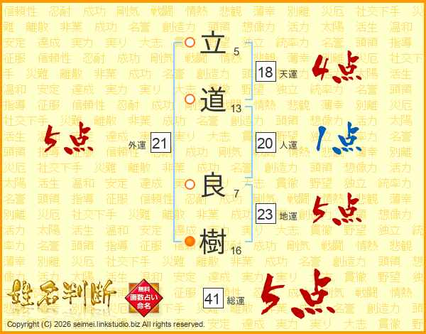 生活面を象徴する運勢です。外部から受ける影響力を表し、結婚運、家庭運や職場、環境への順応性を表します。総運から人運を引いた画数。姓や名が1文字の場合を除く。