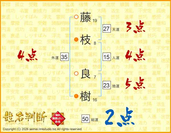 藤(19画)枝(8画) 良(7画)樹(16画)