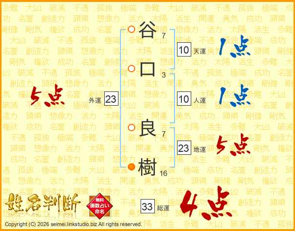 谷(7画)口(3画) 良(7画)樹(16画)