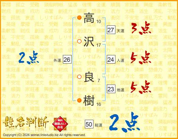 高(10画)沢(17画) 良(7画)樹(16画)