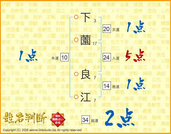 生活面を象徴する運勢です。外部から受ける影響力を表し、結婚運、家庭運や職場、環境への順応性を表します。総運から人運を引いた画数。姓や名が1文字の場合を除く。