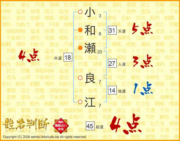小(3画)和(8画)瀬(20画) 良(7画)江(7画)