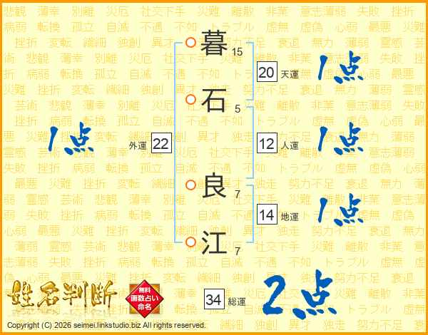 生活面を象徴する運勢です。外部から受ける影響力を表し、結婚運、家庭運や職場、環境への順応性を表します。総運から人運を引いた画数。姓や名が1文字の場合を除く。