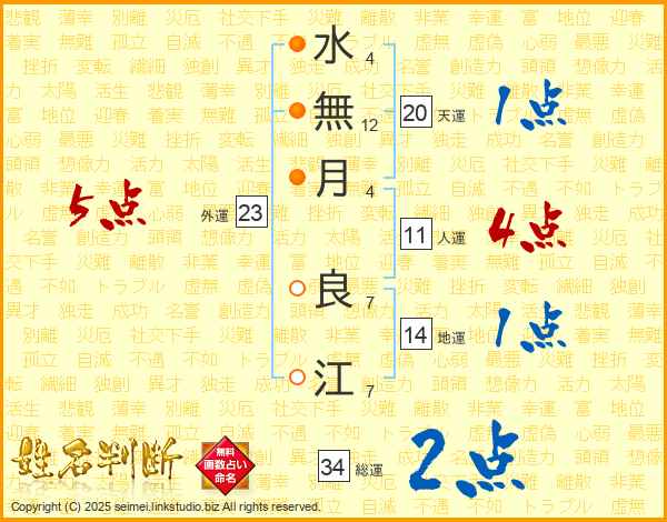 水(4画)無(12画)月(4画) 良(7画)江(7画)