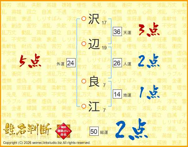 生活面を象徴する運勢です。外部から受ける影響力を表し、結婚運、家庭運や職場、環境への順応性を表します。総運から人運を引いた画数。姓や名が1文字の場合を除く。