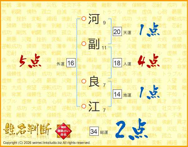 生活面を象徴する運勢です。外部から受ける影響力を表し、結婚運、家庭運や職場、環境への順応性を表します。総運から人運を引いた画数。姓や名が1文字の場合を除く。