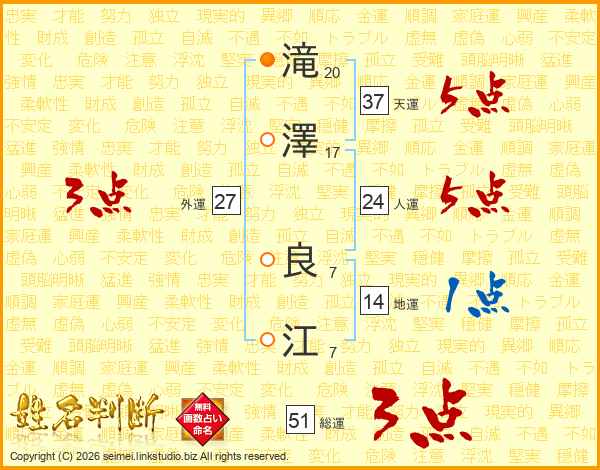 滝(20画)澤(17画) 良(7画)江(7画)