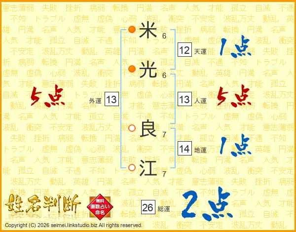 生活面を象徴する運勢です。外部から受ける影響力を表し、結婚運、家庭運や職場、環境への順応性を表します。総運から人運を引いた画数。姓や名が1文字の場合を除く。