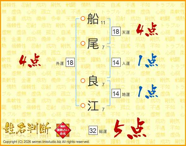 生活面を象徴する運勢です。外部から受ける影響力を表し、結婚運、家庭運や職場、環境への順応性を表します。総運から人運を引いた画数。姓や名が1文字の場合を除く。