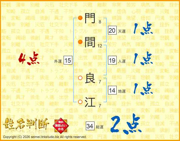 生活面を象徴する運勢です。外部から受ける影響力を表し、結婚運、家庭運や職場、環境への順応性を表します。総運から人運を引いた画数。姓や名が1文字の場合を除く。
