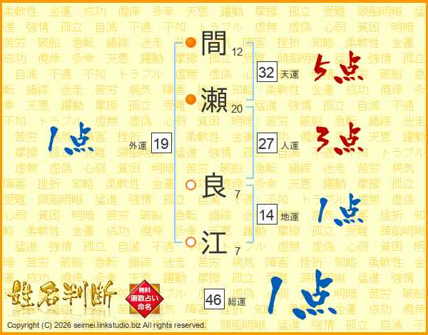 生活面を象徴する運勢です。外部から受ける影響力を表し、結婚運、家庭運や職場、環境への順応性を表します。総運から人運を引いた画数。姓や名が1文字の場合を除く。