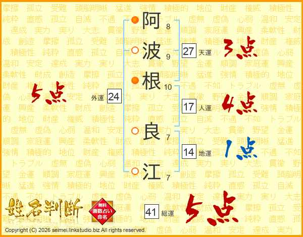 阿(8画)波(9画)根(10画) 良(7画)江(7画)