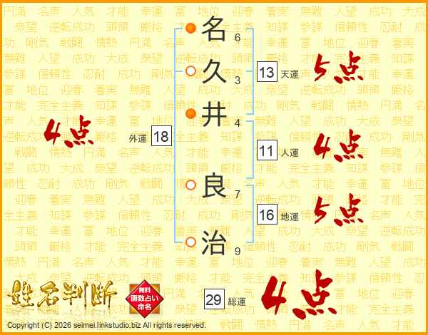 名(6画)久(3画)井(4画) 良(7画)治(9画)